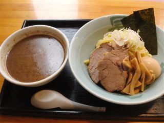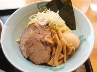 しばらくして出てきたつけめんは、麺は極太の縮れ。縮れというよりも「ねじれ」ている感じです。極太なのでモチモチとした食感が味わえます。つけ汁は豚骨魚介系の濃厚なものです。途中で酢を入れて味の変化を楽しみました。具は、麺の上にチャーシュー(厚・2)・メンマ・のり(2)・味玉子・ネギ。歯ごたえのあるチャーシューとともに、極太の麺というごっつい感じのつけめんです。(2010/09)