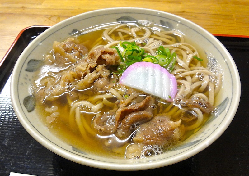 阿波池田駅で50分弱の待ち時間となった。7時45分からの営業という情報があったが7時57分の列車に乗る予定だったので、ここで食べるのは諦めていた。しかし、7時35分にお店が開き、おそるおそる店内に入り「おそば食べられますか?」と尋ねると、「どうぞ」といううれしい返事。メニューは、肉そば630、天ぷらそば630、鳴門わかめそば600、きつねそば525、月見そば500、かけそば450、冷やし祖谷そばぶっかけ600、他定食など。肉そばと注文する。