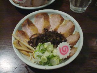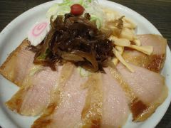 まず別皿で、特製とろ肉を含む具が運ばれて来ました。特製とろ肉・メンマ・キクラゲ・なると・ネギ・小梅。とろ肉とは豚の頬の肉で一頭からわずか200-300gしか取れない貴重な部分だそうです。だから値段が高いのでしょう。麺が来るまでそのとろ肉を食べました。非常に柔らかく、マグロのトロの食感に近いです。