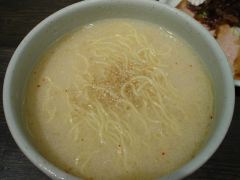 さて麺とスープの登場です。白濁した豚骨スープに麺が入り、白ゴマがトッピングされていました。スープはやや油の多さを感じたものの、結構美味しいです。麺も加水率が低い旭川ラーメンの麺で、麺が美味しいんです。途中から、とろ肉をスープに浸して食べました。するととろ肉はさらに美味しくなります。スープの熱でとろ肉の脂肪分が溶け出したのでしょう。1,200円は確かに高い単価ですが、場所と内容を考えるとしょうがないでしょう。