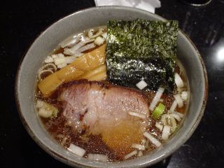 他のお客さんも居るのに、すぐに私にらーめんが出てきたということは、何か特別なイベントでもあるのだろうか。小さめな口で深い丼で出てきたらーめんのスープはまろやかな魚介系の和風醤油味。麺は細縮れ麺で喉ごしも良い。具は、チャーシュー(厚)・メンマ(太)・のり・ネギ。メンマは歯応えがよく特出もの。(2004/12/04)