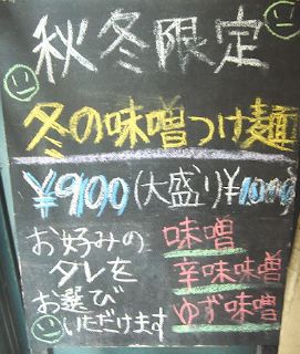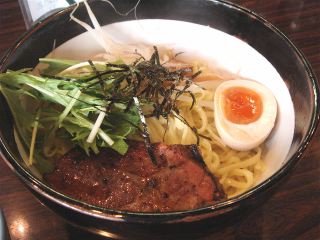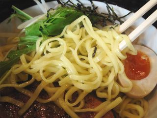出てきたつけ汁は魚介の香りとゆずの香りがマッチしている。味噌もそれほど強くなく、上品な味噌汁という感じだ。麺は中平打ちやや縮れで美味。具は、炙りチャーシュー・メンマ・味玉子(1/2)・もやし・三つ葉。炙りチャーシューはめちゃくちゃ柔らかくて香ばしい。スープ割りも小さなとっくりで届けられ、さらにゆずの香りが増すような気がした。これはまいった!(2008/10/12)