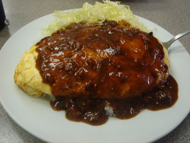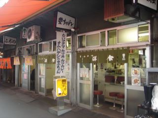 築地市場といえば、多くの人は寿司を思い浮かべるでしょう。しかし、多種多様のお店が集まっているのです。この豊ちゃんはテレビなどで何度も紹介された有名な洋食屋さん。よく紹介されるのは、カツ丼(これは煮込みカツ丼)のご飯とカツを別々の皿に乗せた「アタマライス」。カツ丼のアタマ(カツ)とライスという意味なんでしょうね。次いで紹介されるのが、この「オムハヤシ」。ご飯の上に半熟薄焼き玉子を乗せて、その上からハヤシソースをかけたもの。キャベツもついてます。半熟玉子と、濃厚なハヤシソースの相性は抜群です。(2006/05)