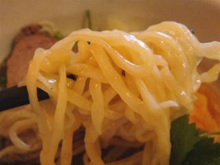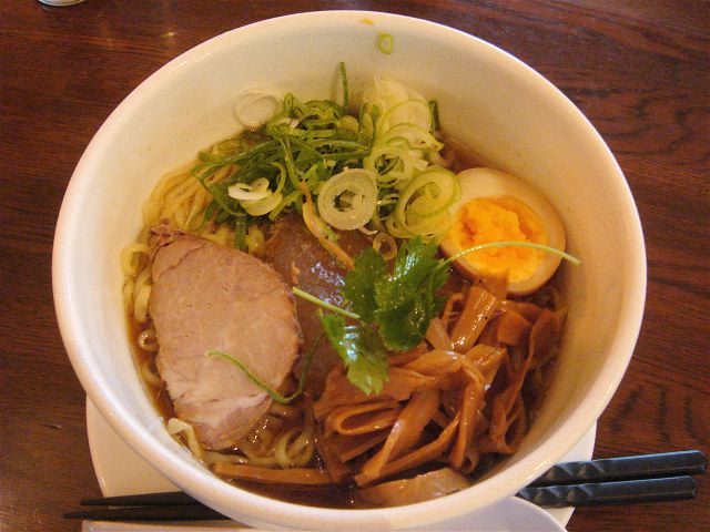 しばらくして出てきた山形水ラーメンは、冷たいスープに冷たい麺が入ったもの。よく見るとスープの温度が冷たいままであるように、スープで出来た氷がまん中に入っている。「だし氷」と呼ぶらしい。スープは魚介系のダシが利いており、暑い夏にはピッタリのヒンヤリ系。麺は中細の平打ち麺で、よくしまっており美味しい。具は、チャーシュー・ミツバ・メンマ・ゆで玉子(1/2)・ネギ。(2010/06)