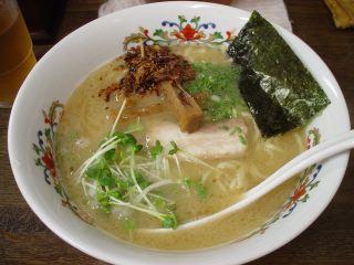 和麺というから、透き通ったスープのラーメンを想像していたが、スープは、見た目は白く濁っている。おそらくガラ系白湯で魚介系がミックスされている。すっきりしていて美味しい。麺は中太ほぼストレート。丸富製麺の卵麺で、この太さはかなり特徴的。具は、チャーシュー(美味)・メンマ(極太)・のり・かいわれ・揚げネギ・ネギ。全体的には渡なべスタイルに似ている。何か関係があるんだろうか?(2005.06.16)