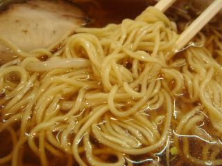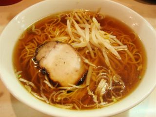 スープは中華風でさっぱりしていて、デフォルトで胡椒が入っている。麺は、中細やや縮れで、なめらかさは抜群で喉ごしがよい。具は、チャーシュー ・もやし・ネギとシンプル。値段がやや高いがこれも東京ならではか。 (2007/10/25)