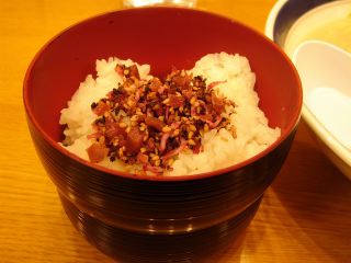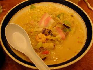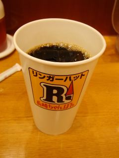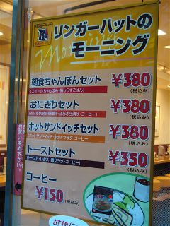 リンガーハットもモーニングをやっている。メニューは朝食ちゃんぽんセット(スモールちゃんぽん・梅ごはん・飲み物)380、おにぎりセット380、ホットサンドイッチセット380、トーストセット350、コーヒー150。なかなか安い。朝食ちゃんぽんセットを注文。まずは、アイスコーヒーが出てきて、その後にスモールちゃんぽんと、梅ごはんが出てきた。ちゃんぽんでかなりお腹がいっぱいになったので、梅ごはんは半分残した。(2007/12/2)