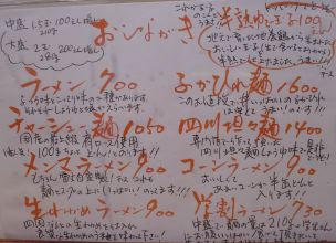 私はラーメン(こってり味)と雷文丼と漬け物がセットになった定食(900円)を、妻はラーメン(ふつう味)を注文。スープの味が二種類選べるのだ。麺も細麺と太麺があるらしいが、この日は細麺のみであった。さて出てきたラーメンだが、こってり味のスープはとりがらやとんこつや日高コンブでだしがとってありうまみがあるが、にんにく味がやや強く、ふつう味の方がよかった。麺は細麺やや縮れ麺でコシがあり旨い。具は、チャーシュー(1)・メンマ・わかめ・ネギ。チャーシューはとろける柔らかさで美味。雷文丼は、チャーシュー・メンマ・ネギの細切りの混ぜ御飯でこれも絶品。店はやや狭いが、雰囲気はとても安心感がある。