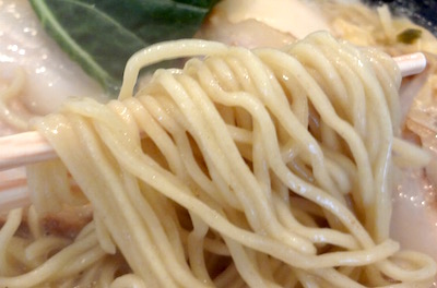 外観ばかりか、内装もおしゃれなカフェバー風である。女性店主が女性の視点で作ったのであろう。女性が一人でも違和感なくラーメンを食べることができるだことだろう。ほどなく出てきた味玉らぁめんは、スープは白濁しており豚骨ベースだが魚介系の香りもする。あっさりすぎず、こってりすぎずに適度な濃度である。何かスパイスが入っているように感じたが私の舌では判別できない。麺は中細ストレートでやや柔らかめ。具は、味玉子・チャーシュー・メンマなど・のり・キヌサヤ・ネギ。味玉子は半熟で醤油味がよくしみており美味。チャーシューも柔らかくて美味。ネギは1cm弱の四角い形をしたもの。(2005.07.23)