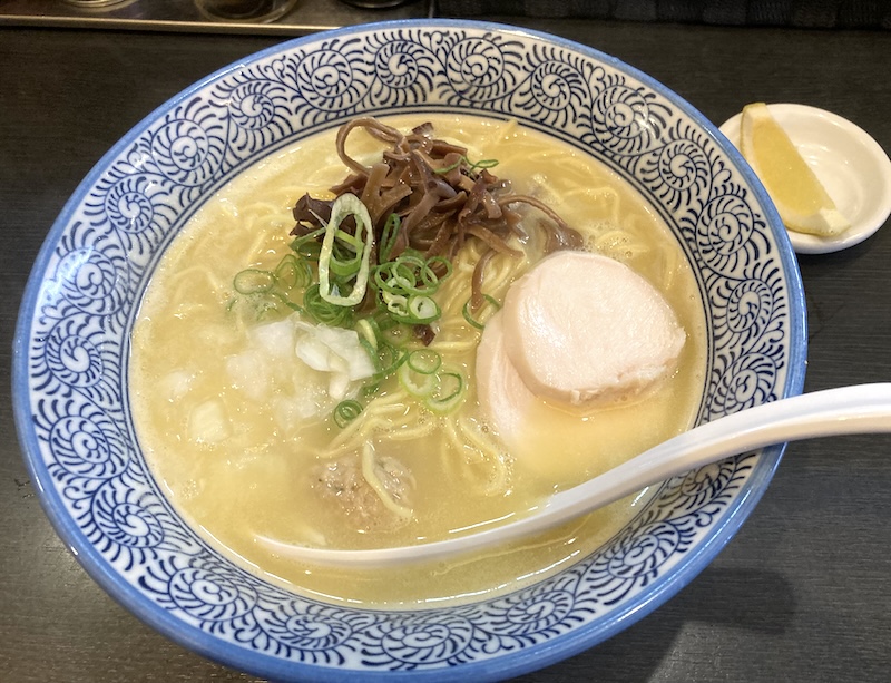 今日は曙橋での仕事の二日目。今日は濃厚鶏の店の晴壱(はるいち)へ。メニューは、濃厚鶏白湯そば1000、濃厚醤油鶏そば1000、濃厚旨辛鶏そば1020、あご出汁鶏そば920、白湯鶏つけそば1020、魚介醤油鶏つけそば1020など。基本メニューであろう鶏白湯そばの食券を買いカウンター席へ。かなりの濃度の鶏白湯スープに縮れ中細麺。具には鶏チャーシューや鶏つくねなどがある。(2024/9)
