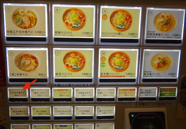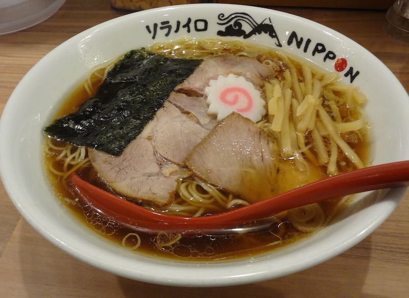 寝台特急サンライズ瀬戸に乗り込む前に、夕食を東京ラーメンストリートで食べようと思う。六厘舎には相変わらずの大行列、斑鳩には中行列、トナリには小行列ができている。ソラノイロNIPPONには行列ができていなかったので入店した。券売機では左上に「特製江戸式中華そば(1,100円)」がある。おそらく全部のせなのだろう。右上の「特製角煮塩ラーメン」は1,200円と単価が一番高い。私は基本メニューの写真赤矢印の江戸式中華そばの食券を買った。カウンター席に座ると紙エプロンをご利用されますかと聞かれた。使用しないと断ったが、女性客にはいいサービスだと思う。カウンター越しには充電用のコンセントがついている。時代は変わった。そうこうしているうちに、たちまち中華そばが登場した。
