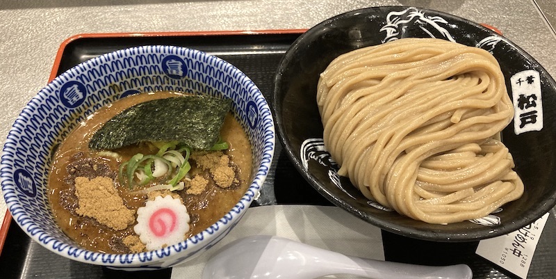 出てきたつけ麺は、麺は自家製の極太麺。スープは豚骨魚介の濃厚なものに魚粉がたっぷり。ワシワシ食べて満腹になり、美味しさで心も満たされた。(2024/5)