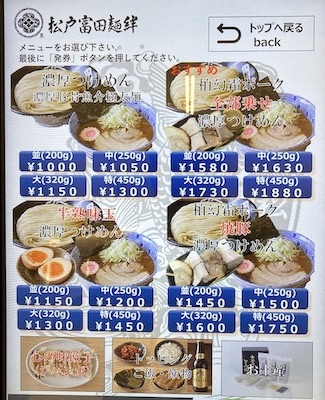 JPタワー地下1階の「ラーメン激戦区」の人気店。HPには「千葉県松戸市にある「日本一のラーメン店」と言われる中華蕎麦とみ田の初の東京直営店舗となります。代名詞のつけめんは超濃厚なスープと、専用粉で作る自家製麺が特徴。業界最高権威の「東京ラーメン・オブ・ザ・イヤー」にて初の殿堂入りや日本一に選ばれる事3度の業界を牽引する超有名店です。」と書かれている。券売機で「濃厚つけ麺 中(250g)」の食券を買う。カウンターに案内されしばし待つ。
