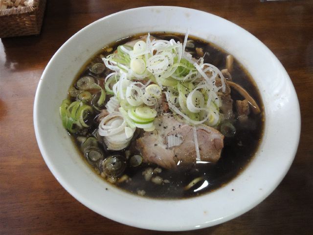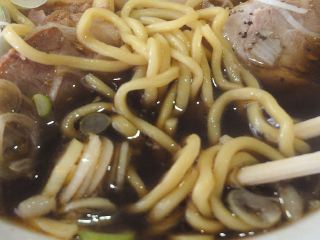出てきたラーメンは噂に違わずに、濃厚な醤油色で見た目は真っ黒! 味ももちろん濃厚です。醤油の辛さを味わえます。麺は、極太ほぼストレート麺で、ムシャムシャと食べる感じ。具は、チャーシュー(大きめな巻きバラ肉2)・メンマ・ネギ・黒胡椒。全体的に言えば、塩辛いスープのラーメンですが、スープに劣らず麺の食べごたえも印象的です。