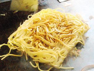 お店の方に作っていただけるようです。手際よく作る様子を写真にしましたが、動画でも撮影しましたので載せますね。若いお姉さんが、いろいろと解説しながら作ってくれました。撮影も許可していただきました。感謝、感謝です。このお姉さんは「せつがう」のことを「いじめる」みたいなことだ、と説明してくれました。あぁ、焼そばになってせちごうてもらいたいです(笑)