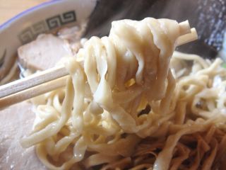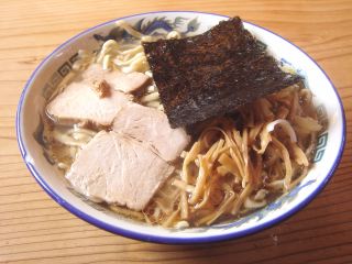 「15番でお待ちの方」と声がかかったので手を挙げた。出てきたラーメンは、鶏と豚骨ベースの醤油スープであり、煮干しと昆布がこれでもかと利いている。個性的なスープである。しかし、どこかで食べたラーメンに似ているなぁ、と思い記憶をたどれば、たかはし@弘前に似ているといえば似ている。麺もまた個性的。平打ちの極太のピラピラ・モチモチし、かん水少なめな麺なのである。麺だけ食べても充分に美味しいのである。具は、チャーシュー(モモ2)・メンマ(細)・のり。ネギ。(2009/5/15)