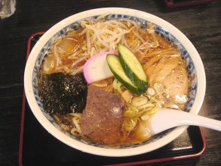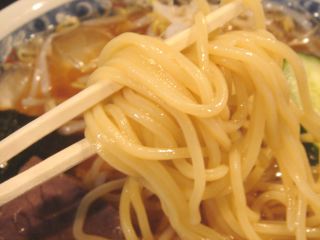 しばらくしてから出てきた冷しラーメンは当たり前ではあるが湯気がない。スープの表面には氷が1-2個浮いている。スープ自体は牛ダシ主体であり、とてもあっさりとしている。牛脂は冷えると固まってしまうので、その除去を充分にしないとこのようなラーメンにはならない。かなりの手間暇が必要であろう。麺は中太ストレートで加水率は高い。具は、チャーシュー(牛・硬い)・メンマ・のり・もやし・きゅうり・紅縁取りカマボコ・ネギ。(2009/5/15)