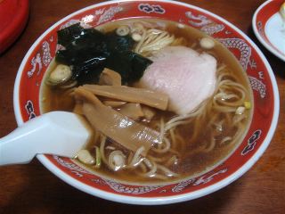 お腹が空いてきたのでラーメン屋を探す。駅前交差点を右に行ってもなかったので、すばやく戻り、今度は左へ行ってみるとあった。さっそく入る。ラーメンと餃子を注文し、テレビでニュースを見ながら待つ。たちまち出てきたラーメンは、スープは甘めの醤油味。麺は多加水やや太めのほぼストレート。具は、チャーシュー・メンマ・わかめ・ネギ。餃子のアンはかなりペースト状に練り込んだものだった。(2009/9/21)
