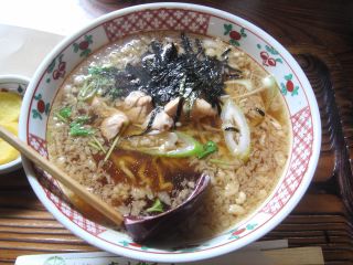 少しして出てきた中華そばのスープは温かい。というのも山形県はいわずと知れた冷しラーメンのメッカであり、ひょっとしてここのも冷しかなぁなんて少しだけ思っていたのだ。スープはそば屋独特のカエシが利き鶏の旨味が全面に出た美味しいもの。表面には天かすがところ狭しと浮かび意外と油っこい感じである。麺は、中太縮れで天かすには負けないような存在感である。具は、鶏肉・刻みのり・天かす・ネギ。(2009/5/14)