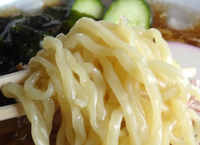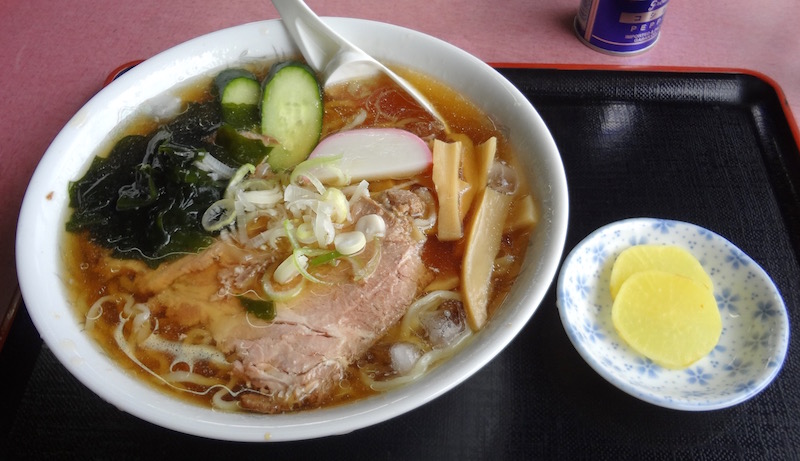 しばらくしてでてきた冷しラーメンには、お新香がふた切れのっていた。冷たいスープが火照った身体を冷してくれる。麺もコシがあり美味しい。チャーシューはかなり分量がある。(2019/05)