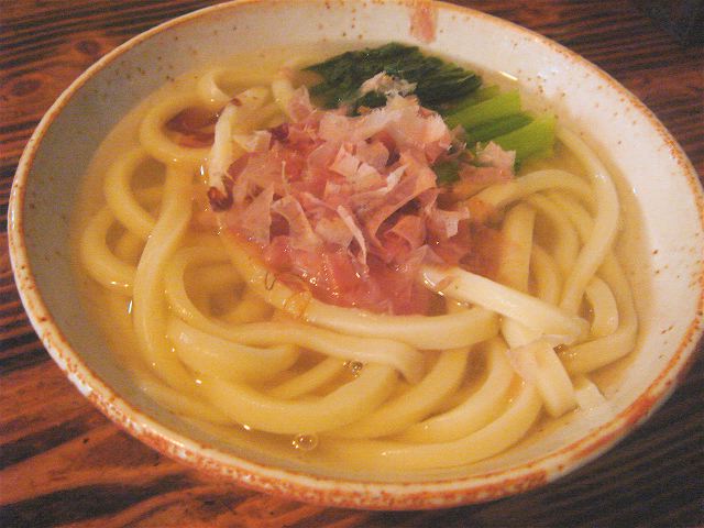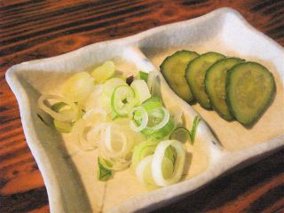 まずはお新香と薬味のネギがでてきます。そしてすぐに湯もりが出てきました。そのままスープを飲むとさすがにあっさりしています。相席の年配の方に指導をいただきながら、醤油と辛し味噌で好みの味付けをしていただきます。やや柔らかめの麺は、毎日食べても身体に優しそうです。(2011/08)