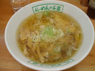店のカラーが黄緑なのか、丼の店名も緑で書いてある。スープは、透明度が高く澄んでいて上品である。味のほうも鶏がじっくりと味わえる。麺は中細縮れ麺でコシがあり美味しい。具は、チャーシュー(鶏肉)・メンマ・ネギ。(2005.2.8)