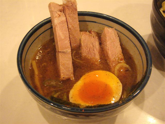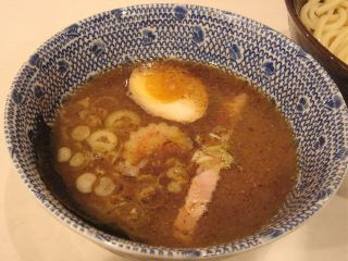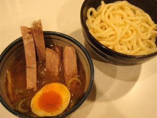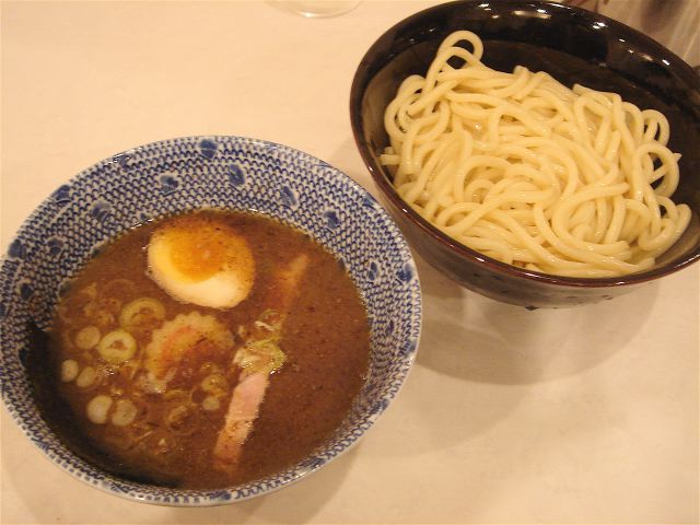出てきたつけめんは、つけ汁の温度が低いのが気になる。温(ぬる)いのである。本店もこんなものなのかな。豚骨魚粉系のつけ汁は、今ではいろいろなお店で食べられるが、最初に川越の本店で食べた人にはきっと衝撃的だったのでしょうね。麺は太麺! コシがあり美味しい。スープ割りしたスープは温度も上がり美味しく飲めました。(2010/06)