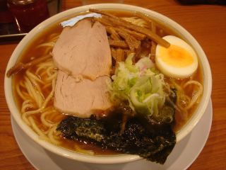 出てきた中華そばは、ドンブリ一杯にスープが注がれ、麺もこれでもかというくらいにドンブリ内に詰まっている。スープは和風の醤油系で魚の香りが食欲をそそる。雑味もあるが、やや薄くどちらかというと上品な感じ。麺は自家製麺で太ストレート麺。モチモチ・ツルツルしていて、“麺をすする”より“麺を食べる”ような感じである。具は、チャーシュー・メンマ・のり・ゆで玉子(1/2)・なると・ネギ。チャーシューとメンマは美味しい。麺の量が多くて、途中でお腹が苦しくなってきたが、気合を入れて食べきった。ふっー、お腹がきつい!(2005.11.25)