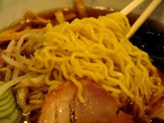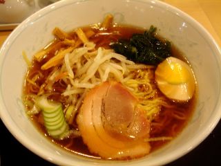 中華ラーメンと中華ラーメンセット(餃子+ライス)の食券を券売機で買う。たちまち出てきたラーメンは、あっさりとしたしょうゆ味で特にこれっていう特徴があるわけではない。麺は縮れていて、具はチャーシュー(と言ってもハムのようなもの)・メンマ・ほうれん草・もやし・ゆで卵(1/4)・ネギ。値段も安いし店も空いていたのでまぁヨシとしよう。お正月だし。(2007.01.02)