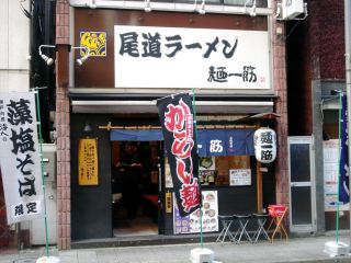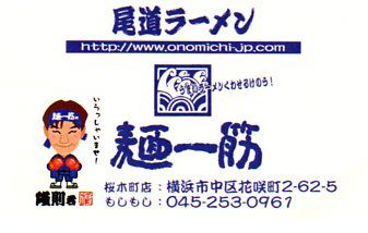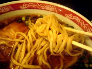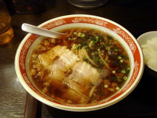 スープは、甘めで魚介系のダシが効いている醤油味。「瀬戸内海でとれた小魚、いりこ、ハギブシ(カワハギの干物)、もみじ(鶏の足)、玉ねぎ、しいたけ、かつお節など」が使われている。麺は、太麺を選んだのだから、平太の縮れ麺。加水率が高くてツルツルとした食感。うどん用の小麦粉を少し使っているらしい。具は、チャーシュー(3)・メンマ・背脂ミンチ・ネギ。(2006.11.12)