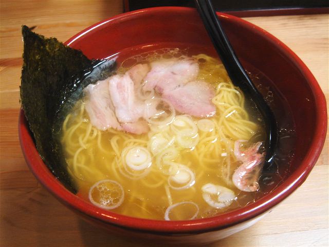 出てきたラーメンのスープは鶏ガラダシの塩味である。エビの風味は少し弱いようだ。麺は細やや縮れで、スープの絡みはよい。具は、チャーシュー・桜エビ・のり・ネギ。スモークしたような薄いチャーシューは個性的である。(2009/10/28)