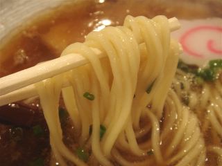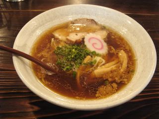 別のお客さんのラーメンを作るのを見ていると、味玉を冷蔵庫から取り出して、専用の小鍋に入れて温めている。こういう丁寧なやり方もあるんだね。でも店主一人で切り盛りしているようなので、忙しくないのかな。その次に私のラーメンを本当に丁寧に作っている。出てきたラーメンは、醤油色に輝く、見た目にも美しいもの。スープは、鶏+豚骨と思われ、細かく揚げた背脂(?)が旨味を増している。麺は自家製の中ストレート麺。とても滑らかで喉ごしもよい。具は、チャーシュー(豚+鶏)・メンマ・ナルト・青ネギ。店主の意気込みを感じる良店。(2009/5/30)