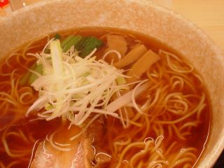 らーめん(醤油)は、スープは柔らかい感じで魚介系ダシの和風である。麺も中細やや縮れ麺であるが少し柔らかすぎると思う。具は、チャーシュー・メンマ・ほうれん草・白髪ネギ。(2005.10.16)