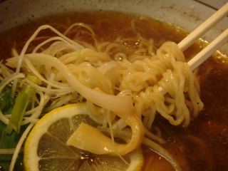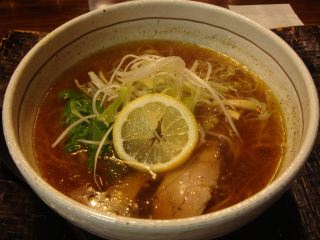 そうこうしているうちに黒酢らーめんがとどく。見た目はそんなに黒くない。まずスープをレンゲで飲んでみる。うっ、酸っぱい! そしてコショウの辛みに口内がピリピリし、思わずむせそうになる。でも、少したってからはそれにも慣れて、今度は美味しく感じてくるから味覚って不思議だ。中華料理のスーラータンに近い味である。麺は中縮れ麺で喉ごしがよい。具は、チャーシュー・メンマ・白髪ネギ・レモン・三つ葉。会計をするときに「いかがでしたか?」と感想を聞かれたので「変わった味で楽しませていただきました。ちょっと辛かったですね。」と言うと「辛みは調節できますので」とのことだった。(2006.4.14)