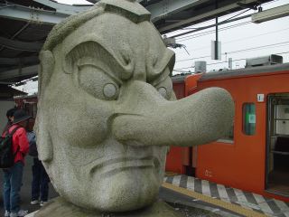 銀座にあるラーメン店の直久が最近はJR構内にも続々と出店しているらしい。この八王子駅にもあるらしいが正確な場所は不明であった。さてJR八王子駅9時56分発の各駅停車高尾行きに乗車。10時03分に高尾駅に到着した。いきなり出迎えてくれたのは、天狗であった。結構でかい。