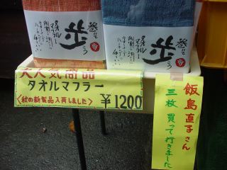 おもしろいものを発見! 飯島直子さんが三枚買ったと書いてある「巻いて歩こう タオルマフラー」と、飯島直子さんがさんまさんにお土産に買っていったと書いてある「焼ネギみそ」です。“さんま”さんと言うのはもちろん明石家さんまのことで、さんまのまんまで先日放映されていたからまぁ確かなことなんでしょう。それにしても赤字で強調するのなら“飯島直子”と“さんま”を赤字にすればいいものを、“飯島直子”と“さんに”が赤字になっているのは意味不明である。