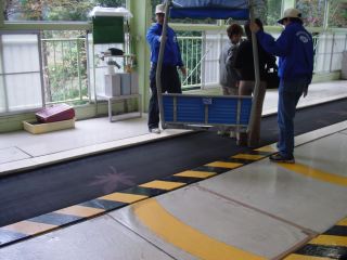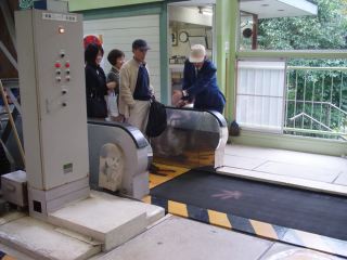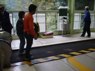 帰りはリフトで山麓駅まで下山(そんなに大げさではないが・・・)である。このリフト、乗り方が結構おもしろい。まず動く歩道のようなベルトコンベアーの手前で待つ。係員の指示があるまで待つ。