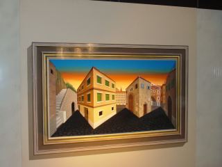 この絵は立体(凹凸がある)なんですが、平面に見えるのです。上半身を動かして首を左右に振るだけで建物の形が変わります。