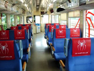 列車が掛川方面からやって来ました。スパイダーマン列車でした。