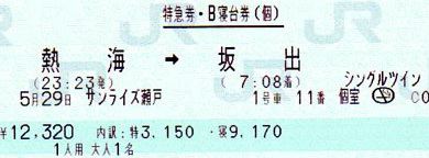 ◆熱海2343-0708坂出 東海道本線・山陽本線・瀬戸大橋線 寝台特急サンライズ瀬戸 特急券3,150円、寝台料金9,170円