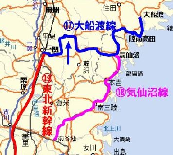 大船渡線の別名はドラゴンレールと呼ばれている。政治的な関係で、直線距離でわずか8kmの陸中門崎と千廐の間の線路は著しく迂回して猊鼻渓や摺沢を通っている。その距離はなんと26.1kmになる。このページのトップの地図の矢印のところが迂回している場所である。線路の形状がドラゴンに似ているでしょう! 一ノ関駅に予定通りに到着した。駅名は「一ノ関」だが市名は「一関」となかなか紛らわしい。一ノ関からは東北新幹線を利用して帰路についた。