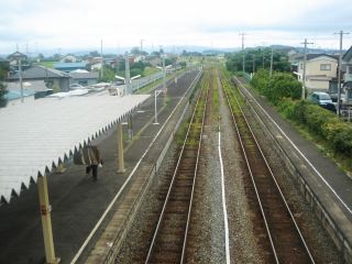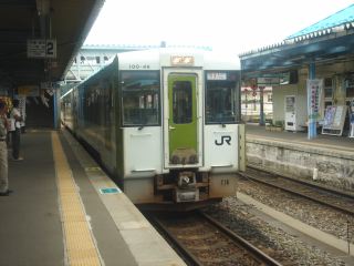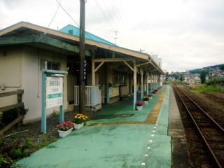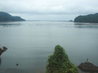 さて今日は肌寒い朝であり、いきなり長袖着用である。南三陸リレー号は気仙沼からの快速南三陸に接続している普通列車である。2両・セミクロス・トイレ付・車掌付である。大船渡から乗車するも海側席とれず。夏休みだけど高校生がそこそこいる。左に見える大船渡湾では養殖が盛んに行われている。陸前高田で高校生下車。そして列車交換を行う。まだ岩手県であるが、この地域の旧国名は陸前である。上鹿折(かみししおり)駅から宮城県に入る。