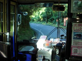 志布志からは鹿児島交通のバスで今日の宿泊先である都城へ向かう。志布志駅の本屋さんで“都城行きのバス停”を尋ねたところ、最寄りの志布志駅上バス停はわかったが、そこに都城行きのバスが通るかどうかはわからなかった。志布志駅上バス停に行き、バス時刻表を見ると都城行きはない。反対側のバス停の時刻表にも都城行きはない。手元に準備していった時刻表を見直すと、志布志駅上に15時46分に発車することになっているが、さっき確認したようにそのバス停の時刻表に都城行きは記載されていなかった。暑い中を志布志港まで歩いて行ったために、時間がだんだんなくなってくる。そこで近くのホテルポラリスのフロントへ行き尋ねたが、詳しくは知らないという。しかしさすがはホテルである。志布志近辺のバス時刻表というパンフレットが用意されていた。それによると時刻が若干変わったらしく16時に志布志バス停から出発すると記載があった。志布志バス停までの行き方を教えてもらい、バックパックで再び5分ほど歩く。やっとみつかった。時刻は15時55分。ギリギリセーフである。もちろん汗ビッショリである。