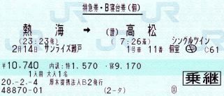 運賃は、小田原〜高松が720.8kmであり721〜760kmに該当するため10,190円になり、JR四国加算190円を加え、10,380円(往復割引で9,340円)となる。しかし、720kmを少し超えただけなので割高になると判断し、早川で分割し、小田原〜早川と早川〜高松に分けて購入した。こうすると、分割しない場合(18,680円)に比べて300円安くなる。また小田原〜熱海をあえて新幹線自由席(840円)を利用することにより、サンライズ瀬戸の特急料金が半額になるので、1,580-840=740円も安くなる。ちょっと注意するだけで1,000円以上も安くなるのだ。
