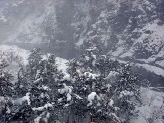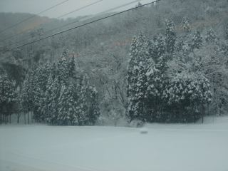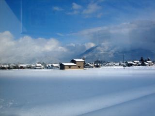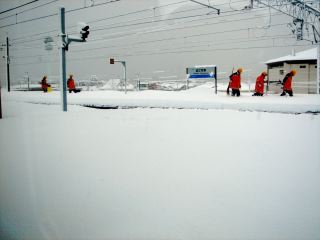 滋賀県に入ると周囲は雪景色である。北陸に近づいているということを実感する。ところが!!! 近江今津駅で緊急停車である。なんとこの先の永原駅構内で雪によるトラブルが発生しているようである。ポイントの故障でもあったのだろうか? まぁしばらくすれば何とかなるだろうと安易に構えていたが、ずっと停車したままである。外を見ると雪はしんしんと降っている。40分以上たってやっと走り出した。福井駅で6分の接続時間で乗り換えを予定していたがもうこれでそれも不可能である。これだけ遅れればかえってあきらめもつく。