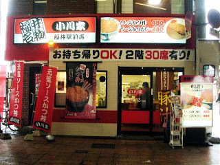福井駅に到着したのは、定刻を1時間以上すぎた10時4分。他の特急列車も軒並み30-60分遅れていて、駅員はてんやわんやの大忙しだった。ところで九頭竜線は予定していた9時6分発の次の列車はなんと12時49分なのである。首都圏では全く考えられない時刻表である。2時間30分以上の時間があるので、えちぜん鉄道に乗ろうかどうか考えるが、雪の影響でえちぜん鉄道が全く遅れないとは断定できず、初志貫徹で九頭竜線に乗るべく時間をつぶすことにする。まずは福井で有名なソースカツ丼のチェーン店の小川家でソースカツ丼を食べる。こちらで言うと吉野家のような感じである。カツ丼のソースは酸味が強く、むせそうになってしまった。カツは薄くでサクサク食べることができる。