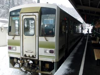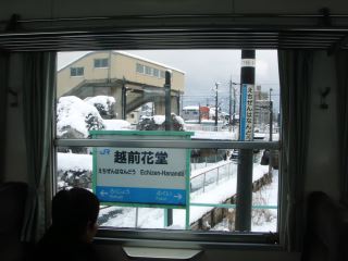 さて切り欠き型のホームに九頭竜線の列車が入ってきた。やっとこれから目的の路線に乗ることができる。2両セミクロスでトイレ付きワンマン車両である。福井を出発すると次は越前花堂駅である。正確にはここから九頭竜線となる。少し離れたところに北陸本線の駅が見えるが、そちらからの乗継客を待っての発車である。外は雪がひっきりなしに降っている。