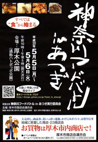 今日5日と明日6日の二日間、厚木公園(通称ハトポッポ公園)で神奈川フードバトル in あつぎというイベントがあったので行ってきました。10時からの開会でしたが、ちょっと出遅れ12時15分頃に開場に到着しました。