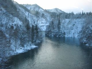 只見駅に近づいてきた。ここでも3分停車する。横からの風にのって雪も横殴りである。只見駅を出ると次の停車駅の大白川までは約30分かかる。その間にある田子倉トンネル(3,712m)を経て、六十里越トンネル(6,359m)を過ぎればそこはもう新潟県である。末広川に沿いながら、こんどは高度をどんどんと下げて、新潟県の最初の駅である大白川駅に到着した。