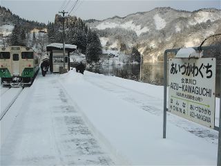 会津坂本駅からは只見川に沿って線路が敷かれている。会津宮下駅でも対向列車と行き違いのために6分停車する。雪が積もると色彩が失われ、モノクロになるので、静寂感が増す感じがする。